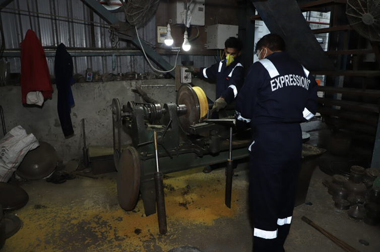 A lathe is used for the shaping of metal holloware by pressing flat stock over a revolving form with a hand tool.